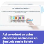 El simulador muestra cómo debe marcar el usuario la boleta correcta para que su voto sea válido. Primero seleccionas tu distrito, en este caso San Luis, donde aparece una simulación de la Boleta Única Papel (BUP). Para votar correctamente, debes elegir un partido y marcar con una cruz el casillero correspondiente; errores como marcar dos opciones o escribir algo no permitido harán nulo tu voto.